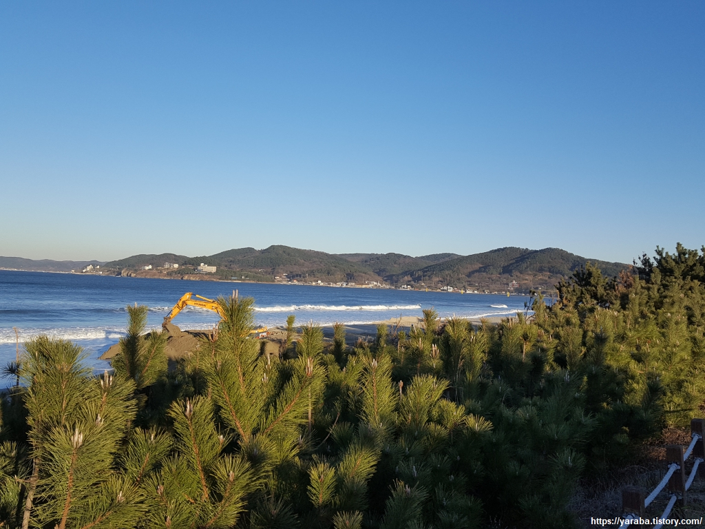 세월이 더 흘러서 이 소나무들의 키가 훌쩍 커지면 숲이 울창해서 바다 풍경을 혹시 못 볼 수도 있겠지만 지금은 소나무 너머의 푸른 바다를 감상하면서 걸을 수 있다. 이곳에서 군 생활을 하던 추억 중에 하나는 여름철 이 해변에 모든 부대들이 나와서 조개 잡기 대회를 했던 기억이다. 허리 정도의 깊이만 들어가도 발을 디딘 모래 바닥이 울렁울렁 저절로 움직일 정도 조개가 많았었다. 얼마 후에는 물이 오염되어 입수가 금지되어 다른 지역으로 훈련을 받았었다.