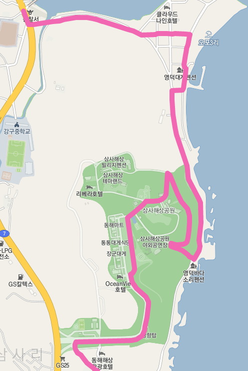 7번 국도를 걷다가 구계항에서 잠시 해안으로 나가지만 다시 국도로 나온다. 다시 남호리에서 해안으로 나가서 삼사 해상 산책로를 걷는다.