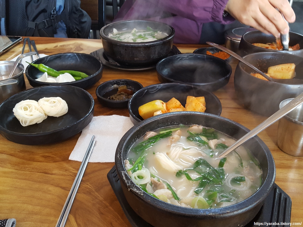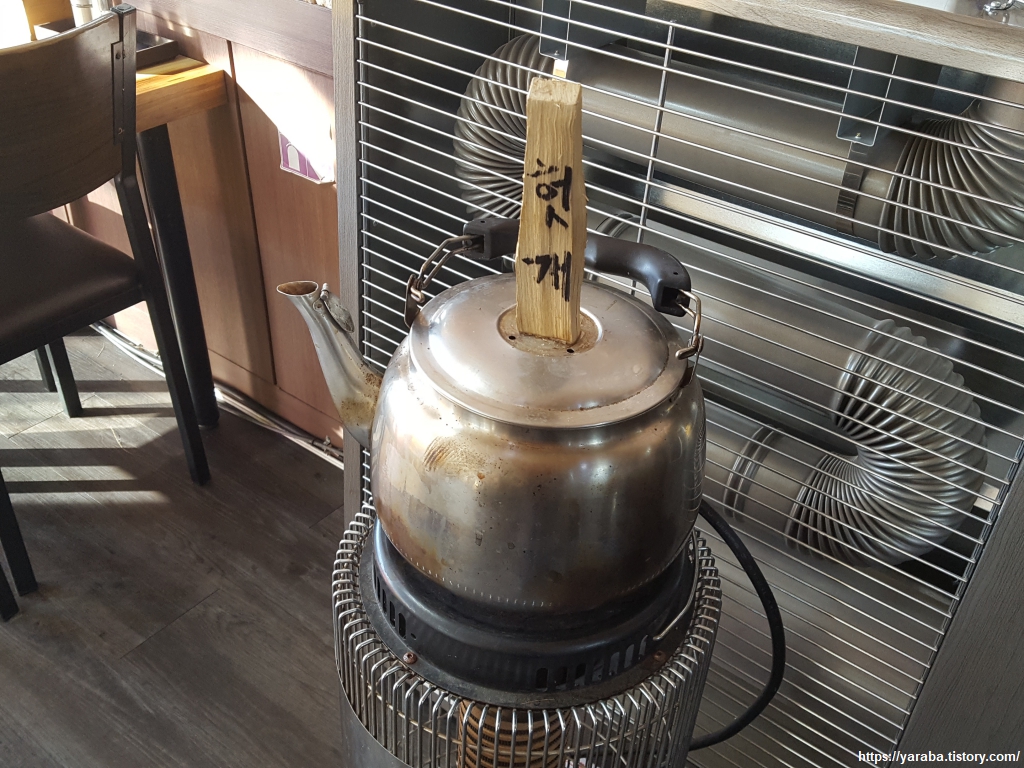 오늘의 아침 식사는 가는 길에서 만난 "가마솥 국밥"이란 식당에서 돼지 국밥으로 먹었다. 음식도 좋았지만 특이한 것은 헛개물을 제공하고 있었다. 주전자 뚜껑이 빠져서 저렇게 해놓은지 모르겠는데 뚜껑에 꽂아 놓은 나무에 쓰인 "헛개"라는 글자 덕택에 주인장이 말을 하지 않아도 물을 찾아서 마실 수 있었다.