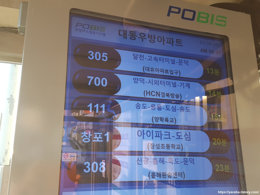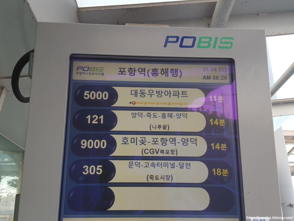 포항역에서 시내버스를 탈 때는 주의해야 한다. 버스들이 역사로 들어왔다가 돌아나가는 형태로 시내 방향으로 가는 버스와 반대 방향으로 가는 버스가 같은 방향으로 오기 때문이다. 신호등에서 우회전하면 시내 반대 방향인 흥해행 정류장이 있고, 시내행 정류장은 그 앞에 있으므로 헷갈리지 말아야 한다. 대부분의 사람들이 시내행 정류장 쪽인 맨 앞으로 몰려있다. 처음에는 이 구조를 모르고 있다가 타야 할 버스가 흥해행 정류장에 왔는데 아무도 타지 않아 쭈뼛쭈뼛했었다. 송도 해수욕장으로 이동하려면 시내행 정류장에서 305, 120, 5000, 9000, 308번 버스를 타고 "대동 우방 아파트" 정류장에서 111번 버스로 환승하면 된다. 111번 버스를 타면 송도 해수욕장이 버스의 종점이므로 종점에서 내리면 된다.