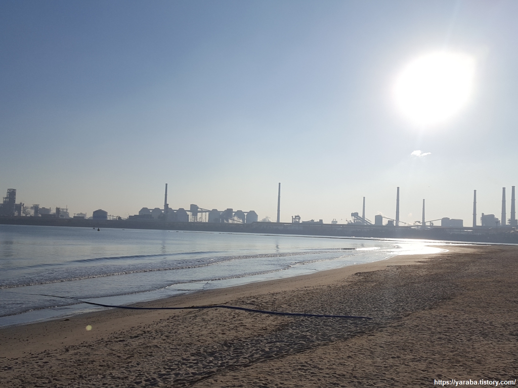 송도 해수욕장에서 바라본 포스코 방면의 모습. 공단 앞으로는 형산강이 흘러나온다. 지난번 여행에서 만났던 야간 조명의 화려함은 태양빛에 가려졌다.