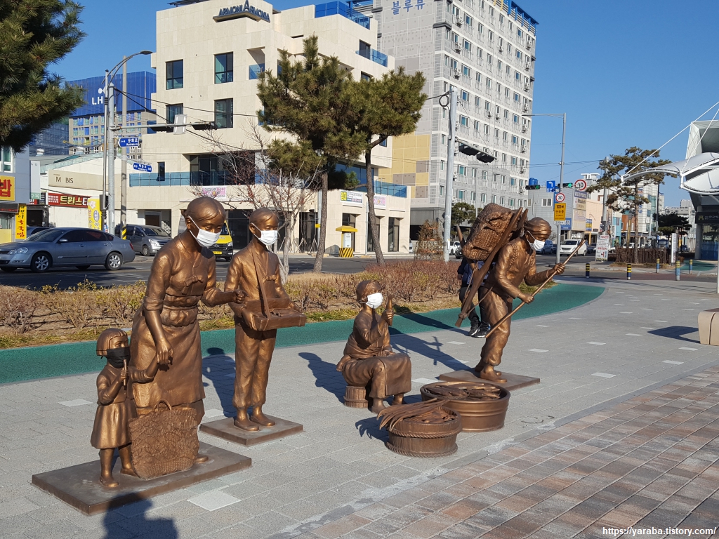 다리를 건너면 우회전하여 동빈 내항을 따라서 해동로 길을 따라 올라가는데 널찍한 산책로 길이다. 산책로에 세워진 인물 작품에 마스크가 씌워진 모습이 코로나가 만든 풍경 같아 씁쓸하면서도 우습다. 이런 것을 두고 웃프다고 하는 모양이다. 아이 손을 잡은 어머니, 엿장수, 좌판을 펼친 할머니, 지게꾼 까지 우리네 옛 장터를 연상시키는 장면이다.
