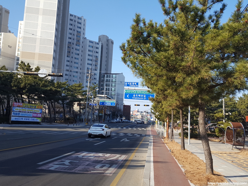 해파랑길은 워터 폴리 직전에 좌회전하여 동빈 큰 다리 방향으로 가야 한다. 송도도 염연히 섬이므로 계속 직진하면 길이 없다. 대각선 방향으로는 송도 송림 테마거리가 있는데, 길가에 세워진 새마을 운동 마크가 있는 풍차가 이채롭다.