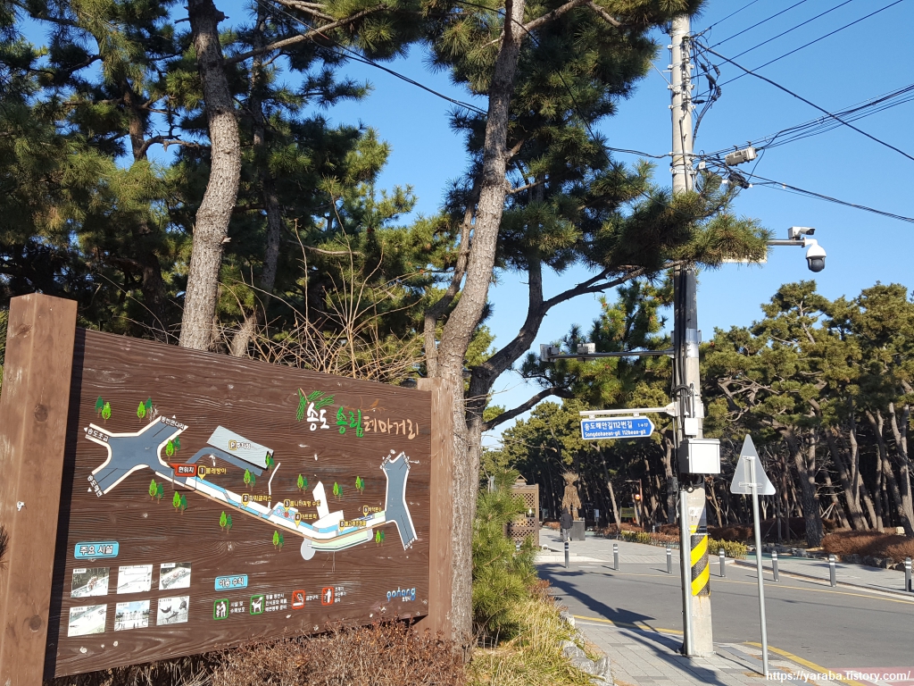 버스 종점에서 내리니 바로 송도 해수욕장의 광장이 눈에 들어온다. 계획은 이곳에서 아침 식사를 해결하고 하루 일정을 시작하려고 했는데, 가는 날이 장날이라고 인근의 기사 식당은 매주 쉬는 날이었고, 이른 아침에 문을 여는 식당이 없었다. 편의점에서 해결할까도 생각했지만 한동안 시내 길을 걸을 예정이므로 일단 걸으면서 찾아보기로 했다.