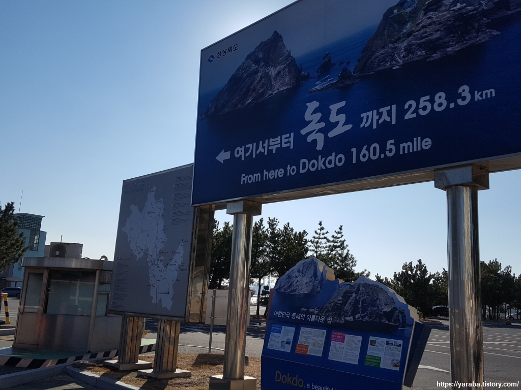 여객선 터미널 앞에 세워진 "독도까지 258.3Km" 표지판. 청년 시절 울릉도에 가고 싶다는 마음 하나로 배낭을 메고 이곳에 왔었다. 힘겹게 서울에서 이곳까지 찾아왔었는데 배가 뜨지 않는다고 하니 정말 당황했었던 기억이 있다. 당시에는 인터넷도 없던 시기였으니, 그 당황한 상태에서 전국 지도를 펴 들고 결정한 것은 동쪽 끝으로 가지 못하니 그렇다면 서쪽 끝으로 가보자 하면서 경전선 밤 기차를 타고 순천을 거쳐 목포에서 홍도로 간 것이다. 도전과 같았던 그 시절의 추억이 아름아름하다.