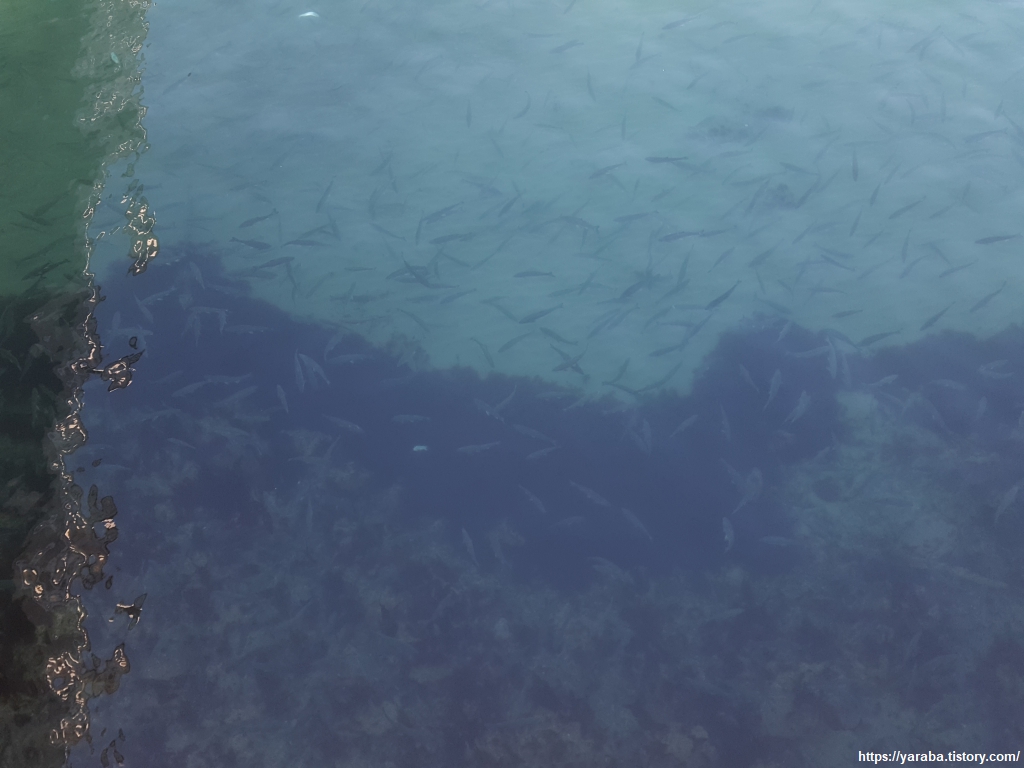 누각 근처 바닷속에는 크기가 팔뚝만 한 물고기들이 떼를 지어 놀고 있었다. 낚시를 할 수 없는 곳이지만 낚시가 있다면 물고기를 보면서 낚시하는 진풍경이겠다 싶고, 투망이 있다면 투망 한 번에 수십 마리를 잡을 수도 있겠다 싶다. 쓸데없는 상상이지만 한동안 물고기를 보며 멍 때리고 있었다.