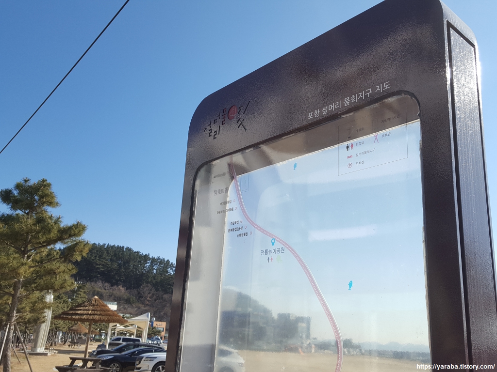 설머리 물회 마을 안내판. 일명 포항 물회가 유명한 지역이다. 광어, 우럭, 가자미 등 이곳에서 많이 잡히는 생선회와 밥, 채소, 육수, 얼음물, 양념장 등을 주면 개인 취향에 따라 비벼 먹는 것이 포항 물회의 특징이라 한다. 엄밀히 말하면 원조 포항 물회는 비빔 물회라고 한다.