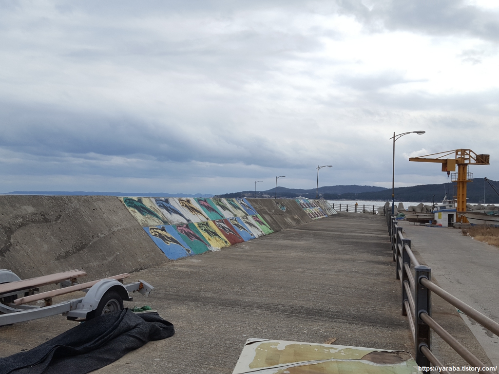 방파제 끝까지 가면 갯바위 위로 조성된 데크길을 통해서 방어리 어항으로 갈 수 있다. 방파제에 그려진 다양한 색상의 돌고래 그림이 이채롭다. 방파제 전체가 다양한 고래 그림으로 채워져 있다.