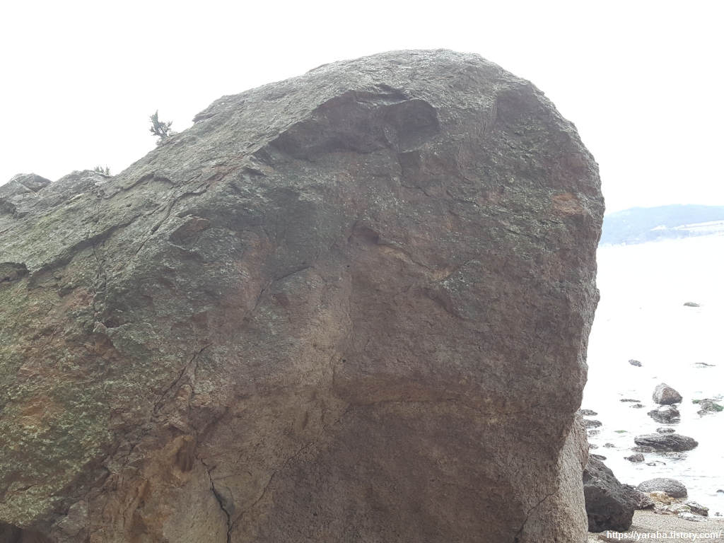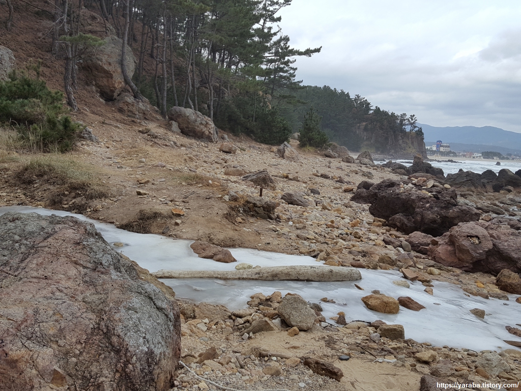 기암괴석의 해안이 계속 이어진다. 자신에게 박혀 있던 돌들을 오랜 세월 하나, 둘 떨구어 내고 쩍쩍 큰 틈까지 보이기 시작한 바위가 파도가 들이치는 해안 한가운데서 소나무 한 그루를 제대로 키우고 있다. 뒤집어 보면 저 소나무가 바위틈에 뿌리를 들이밀면서 바위를 지독히도 괴롭히고 있는 것일지도 모르겠다. 산에서 내려오는 실개천이 꽁꽁 얼어붙었다.