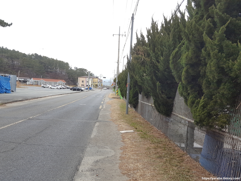 20번 지방도로 나오면 도로변 길을 따라서 용두리 마을길을 가로질러 용두교까지 나아간다. 포스코 수련원 울타리와 향나무가 마치 하나 된 모양새다.