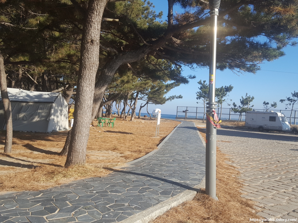 잘 정비된 화진 해수욕장 안으로 들어간다. 굵은 소나무들이 즐비한 해변 주위로 차박 하거나 캠핑하는 사람들이 많다.