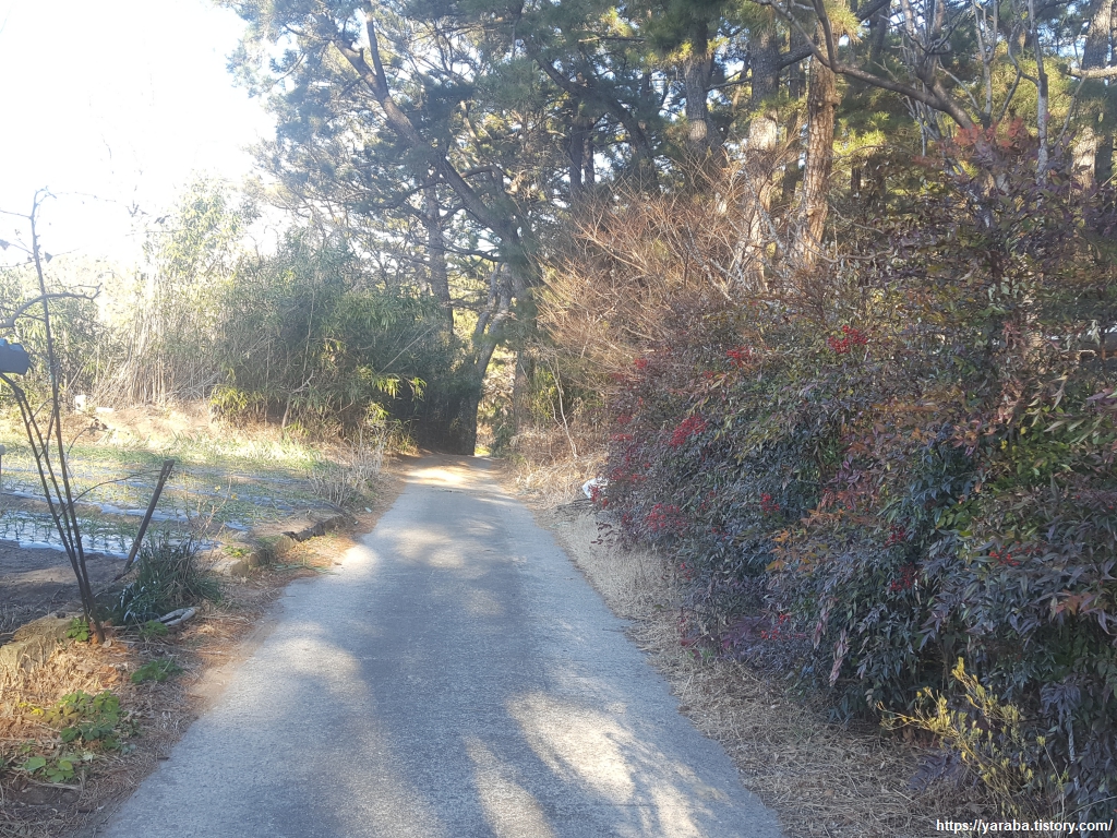 마을길을 지나면 화진 3리에서 화진 해변으로 넘어가는 숲길을 통과하게 되는데, 정말 숨겨놓은 보물과 같은 아름다운 숲 길 이었다. 만약 군부대 때문에 우회하지 않고 그냥 해변 길로 직진한다면 만날 수 없는 정말 아름다운 숲길이다.