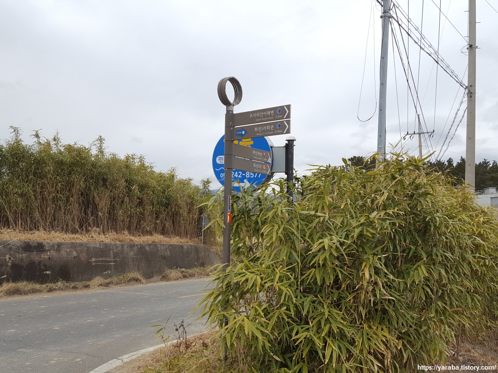 마을길을 가로질러 조릿대가 무성한 해안로를 만나면 화진 3리 마을 회관으로 방향으로 우회전하여 길을 따라 이동한다. 이곳도 그리 도로가 넓지 않으므로 조심해서 길을 진행해야 한다. 다행히 차가 많지는 않았다. 오늘의 숙소인 화진 별장 펜션은 이 길을 가다가 좌회전하면 금방 찾을 수 있었다.