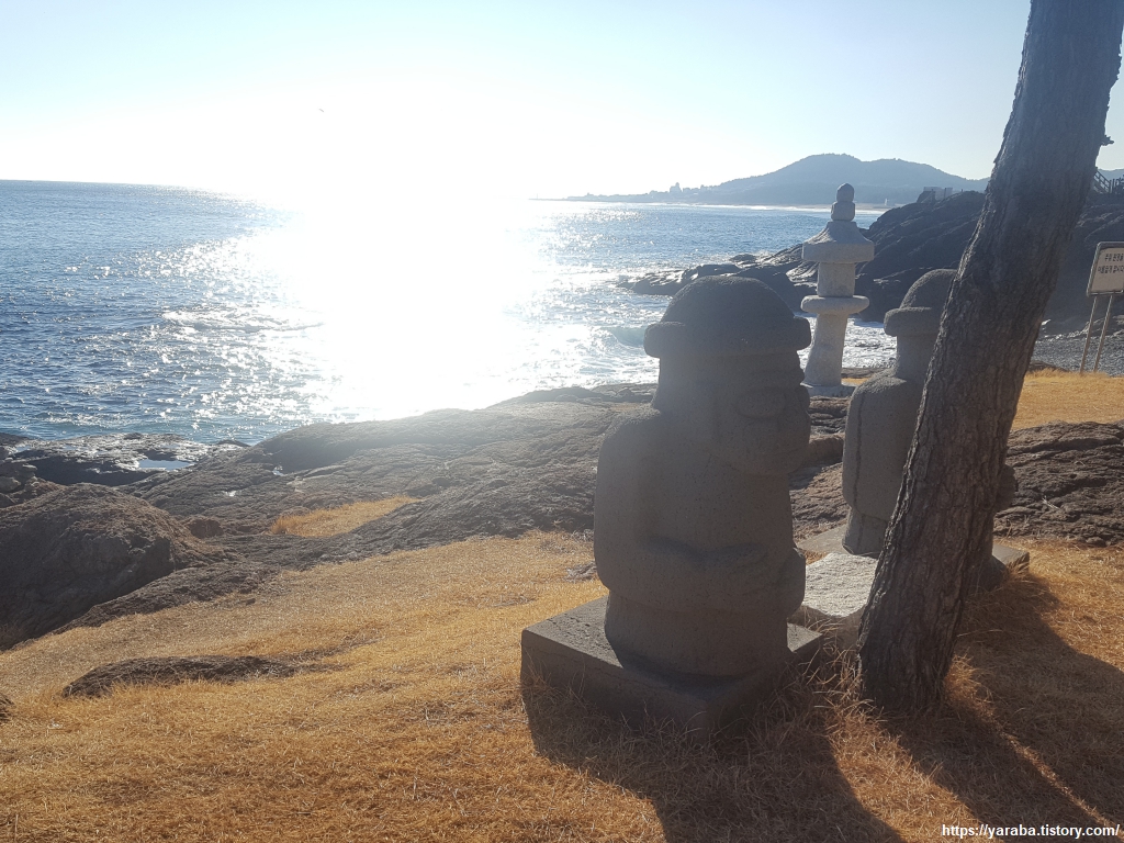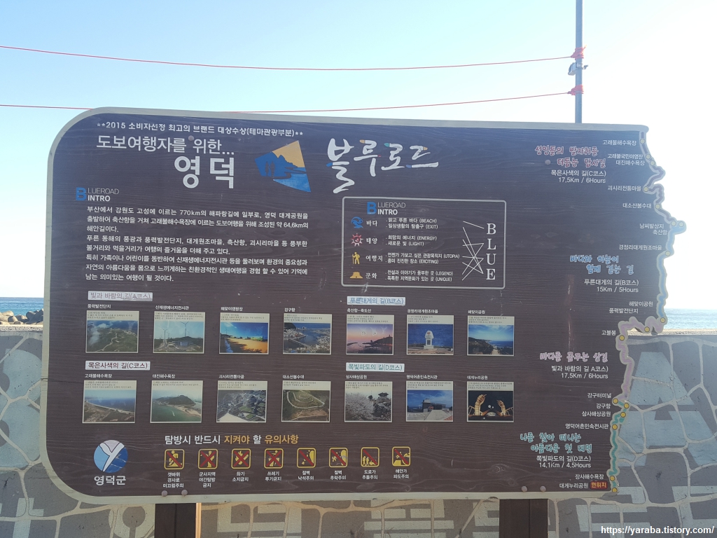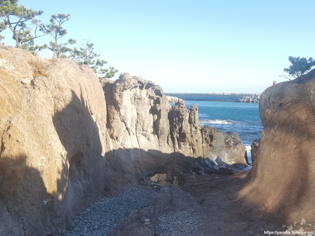 갯바위 위로 조성된 데크길을 통해서 길을 이어간다. 바위 해변 근처로 떨구어 놓은 테트라포드를 보면 굳이 필요했을까 싶기도 하지만 파도로부터 데크길도 마을 해변도 보호하는 역할을 하겠다 생각하면 어쩔 수 없는 모습으로 보인다. 이전 해파랑길과는 약간의 차이가 있지만 블루로드 데크길을 따라간다.