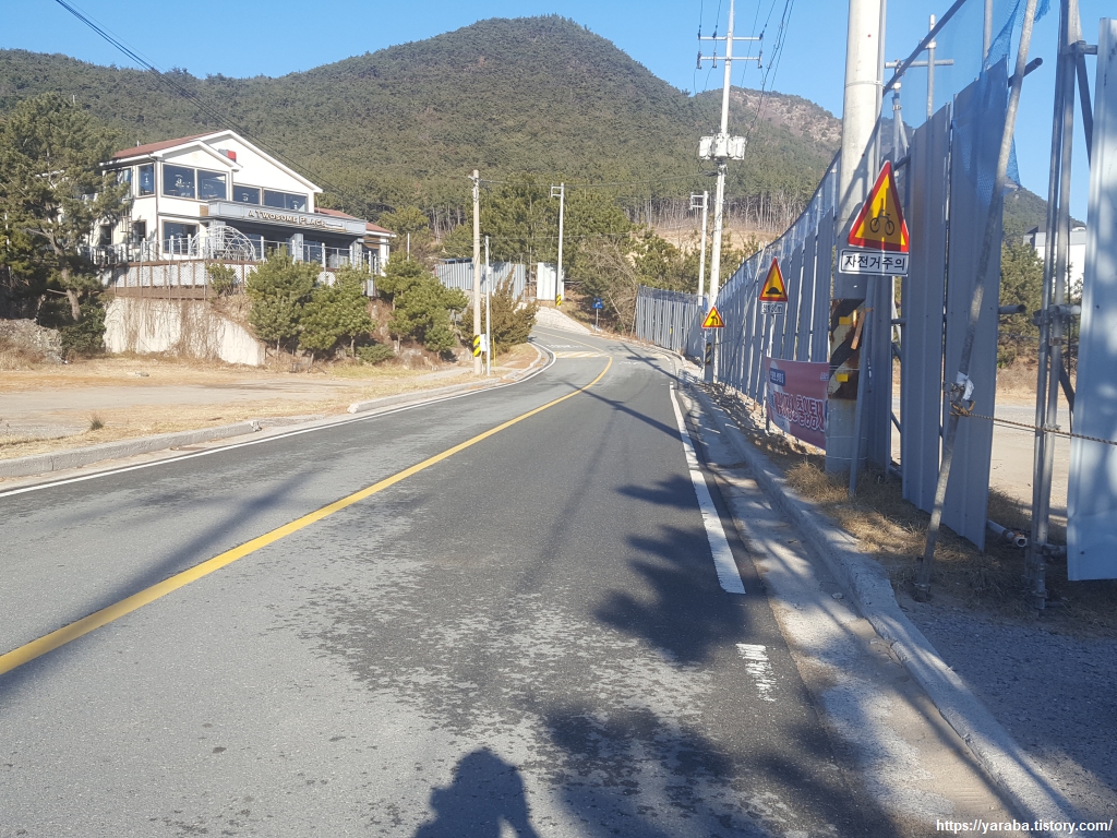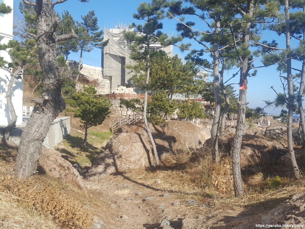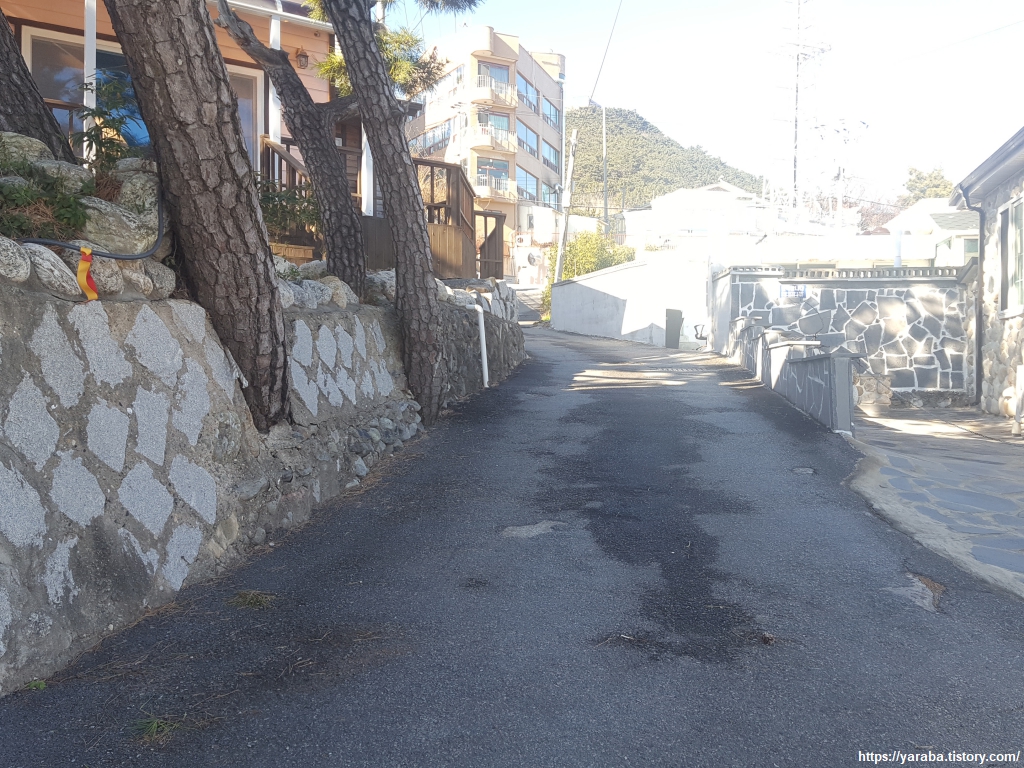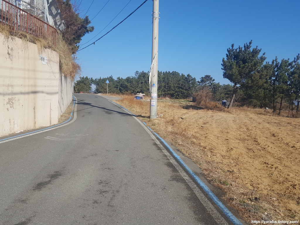 초미니 마을 해수욕장(?)을 만나면 중간에서 오르막 마을길로 빠져서 7번 국도 방향으로 이동한다. 담벼락을 정비하면서 나무를 베어내지 않은 것은 잘한 것 같은데 잘생긴 소나무가 콘크리트에 갇혀 있는 모습은 뭔가 이상해 보인다. 성장에 문제가 없을 것 같기도 하고 문제가 될 것 같기도 하고......