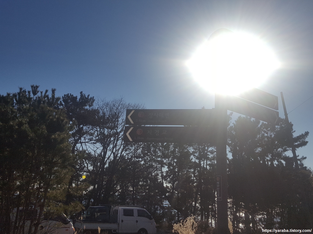 7번 국도변을 걷다 보면 그림처럼 지경교와 장사 해변으로 가는 안내판이 나오는데 이곳에서 해변으로 내려간다.