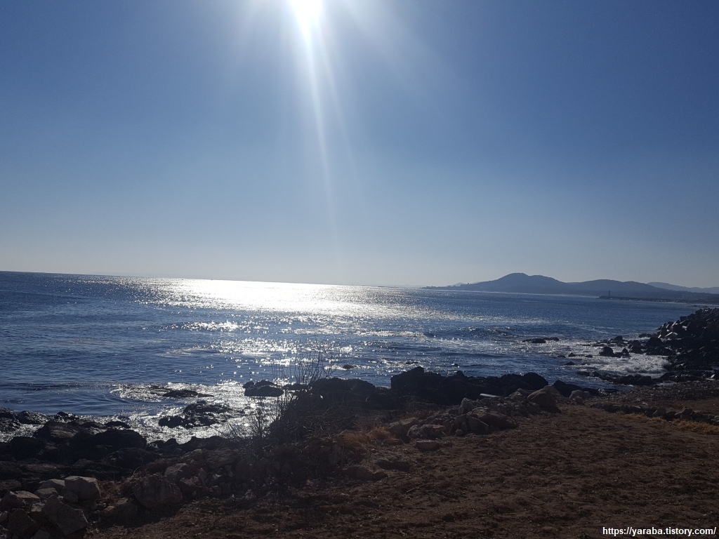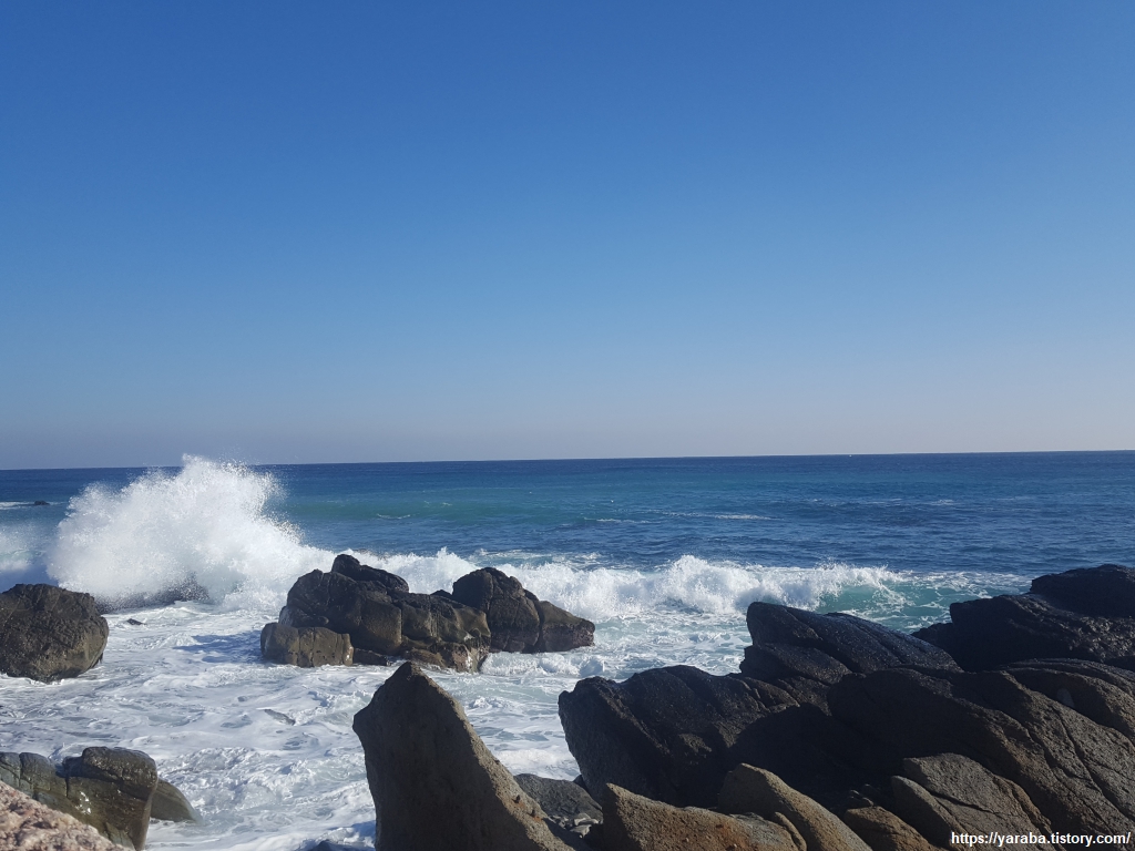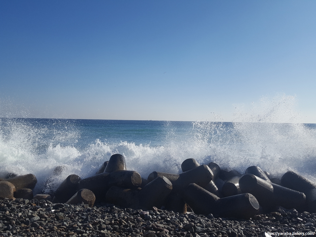 갯바위에 부딪히며 하얗게 물보라를 일으키는 파도가 매섭다. 저런 파도에 테트라포드가 잘 견딜까? 하는 생각이 들 정도로 거센 파도가 밀려온다. 이렇게 화창한 날에도 이 정도라면 태풍이라도 밀려올 때를 상상하면 아찔하다.