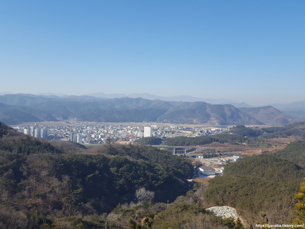 영덕읍내가 한눈에 들어온다. 산 바로 아래로는 7번 국도가 돌아나가고 시가지 외곽으로는 오십천이 휘감고 지나가는 모양새다. 2021년 영덕군은 예산이 5천억을 넘어섰지만 인구는 3만 5천여 명이다. 농어촌 지역 중에는 그나마 인구가 많은 편이다. 대부분의 농어촌 지역이 그렇지만 고령화가 심해서 주요 대도시 및 전국 평균 연령이 40대 초반이라면 영덕은 55.9세 이른다.