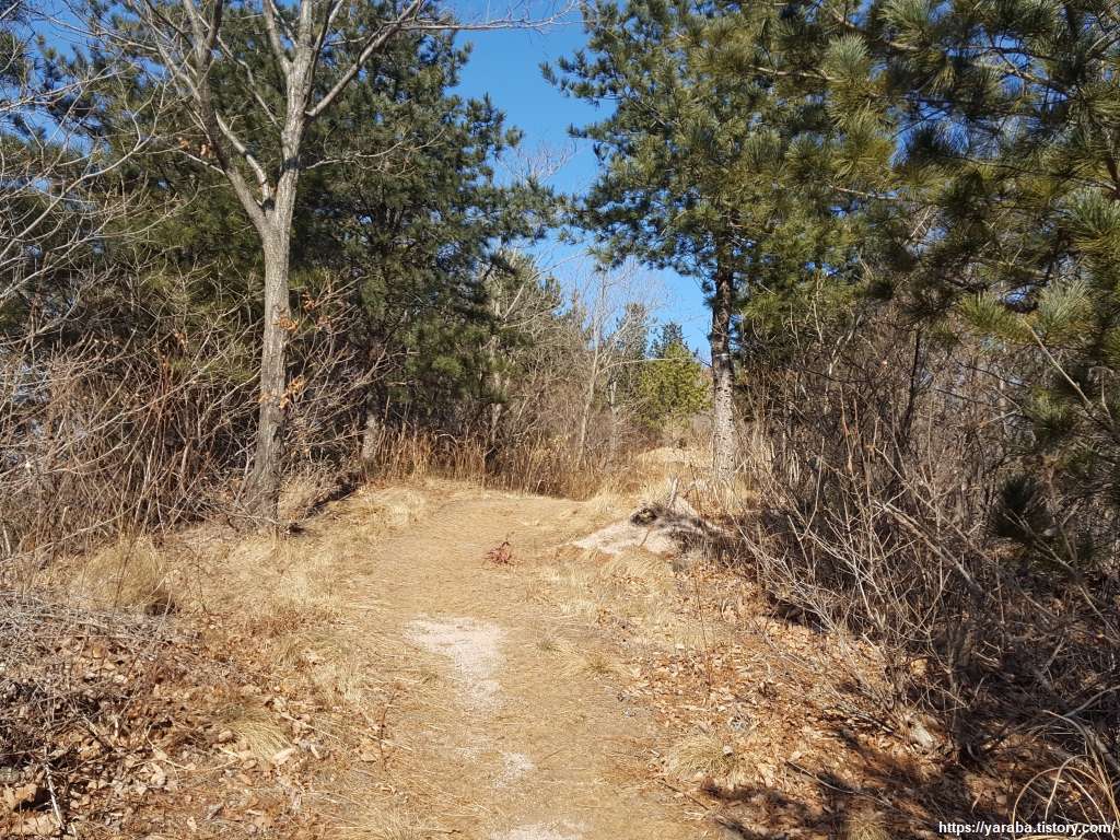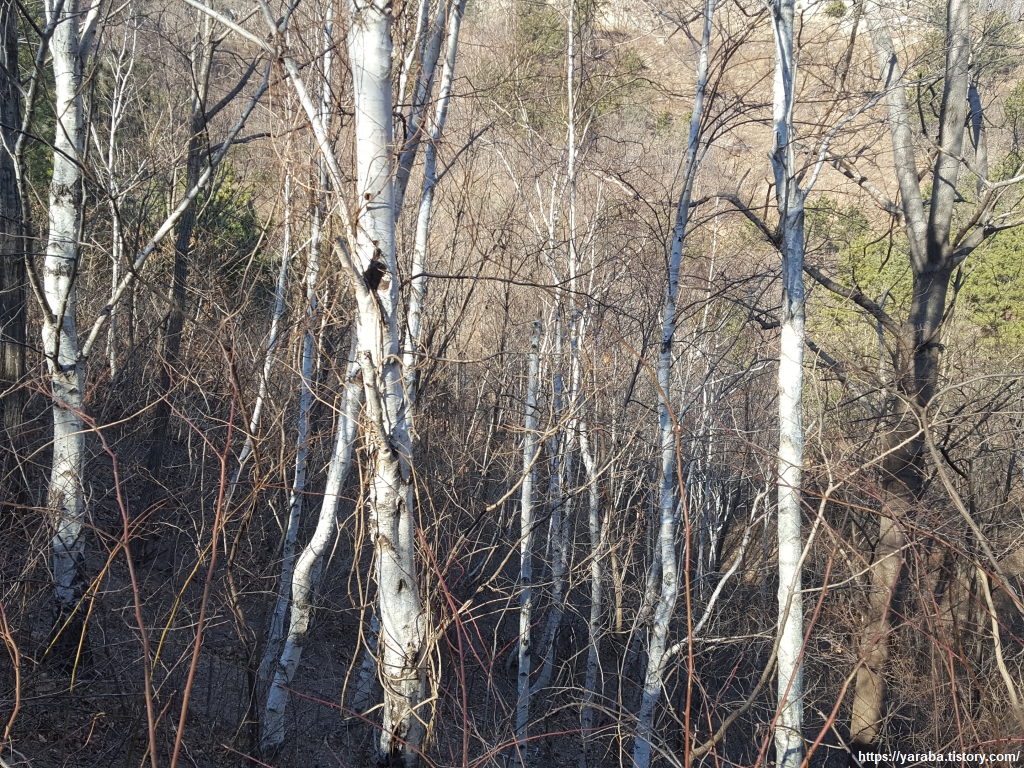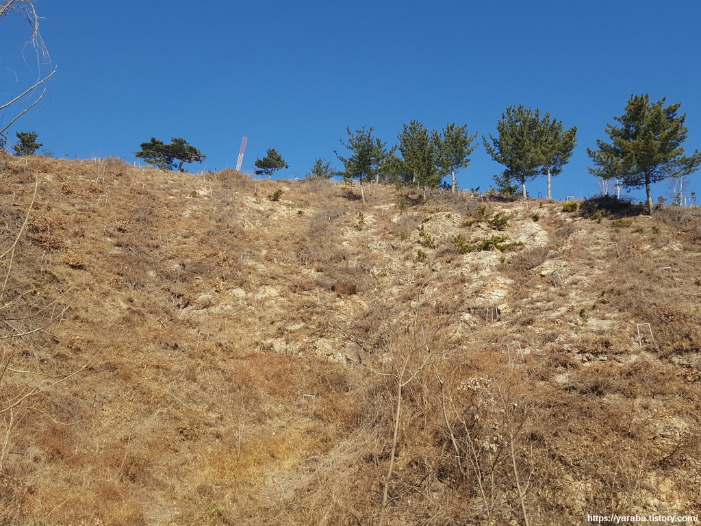 어린 나무들을 심어 놓고 지지대를 받쳐 놓았다. 어린 나무가 자리를 잡을 때까지 5년에서 10년이 걸린다고 하니 쉬운 일은 아니다. 사진처럼 경사가 심하고 척박한 땅이라면 더욱 어려운 일일 것이다. 그렇지만 사람의 의도가 어떠하든 자연이 하는 일 또한 신박하다. 조림지 일부에는 소나무가 싹을 틔워 새로 심은 나무와 경쟁하고 있고 길 근처 어떤 나무는 양분이 많은 땅인지 눈에 띄는 성장 속도를 보인다.