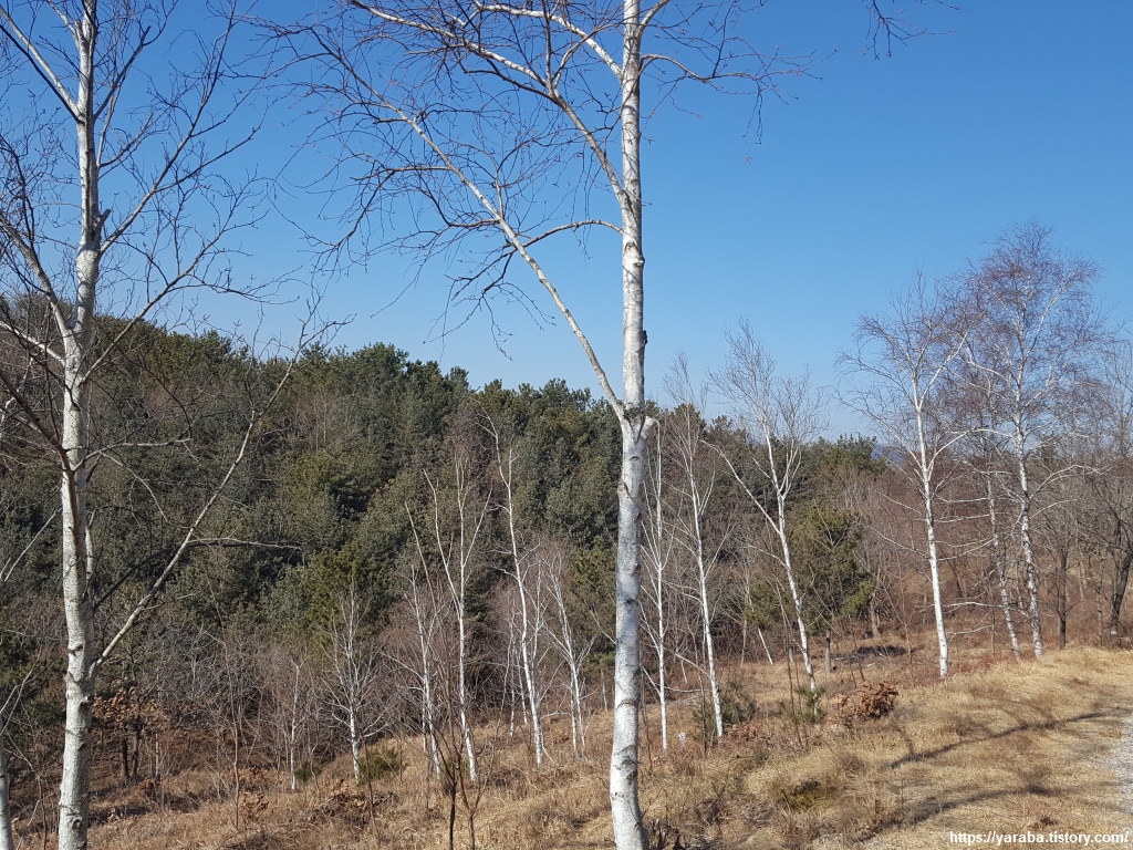 하얀 나무껍질을 가진 자작나무 군락이다. 숲 속의 미인이라 할 만큼 자작나무는 언제나 아름다운 자태를 뽐낸다. 자작나무 껍질이 하얀색인 이유는 추운 지방에 사는 나무답게 눈이 쌓여서 눈에 반사되는 태양빛에 스스로를 보호하기 위함이라고 한다. 자작나무라는 이름이 붙은 이유는 나무를 태울 때 "자작자작" 소리가 난다고 해서 붙은 이름이라고 한다. 자작나무 껍질에는 기름이 많아서 습한 날에도 불이 잘 꺼지지 않는다. 결혼식이나 신혼방에서 화촉을 밝힌다고 할 때, 화촉이 바로 자작나무 껍질을 의미한다고 한다. 예전에는 지금처럼 초가 흔하지 않았으니......