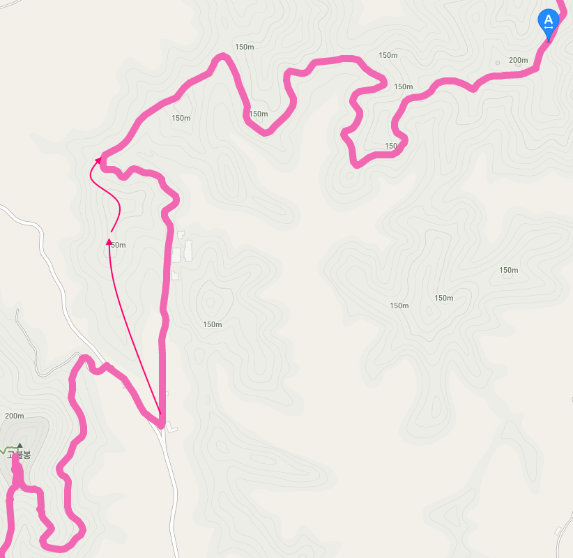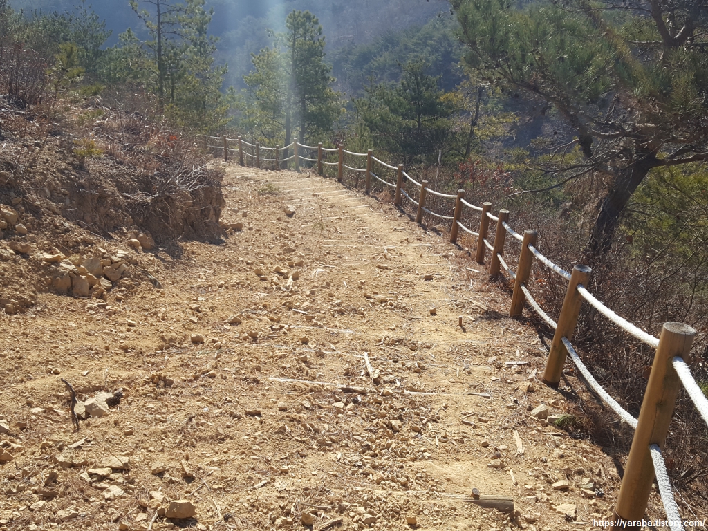 고불봉에서 내려오는 길은 경사가 급한 만큼 시간은 오래 걸리지 않는다. 하저로를 만나면 우회전하여 한동안 도로변 길을 따라 걷는다.