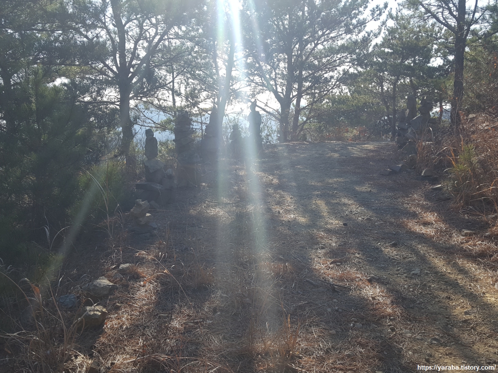 풍력 발전 단지 방향으로 내려가는 길, 누군가 돌을 쌓아놓은 것이 인물상처럼 보인다.
