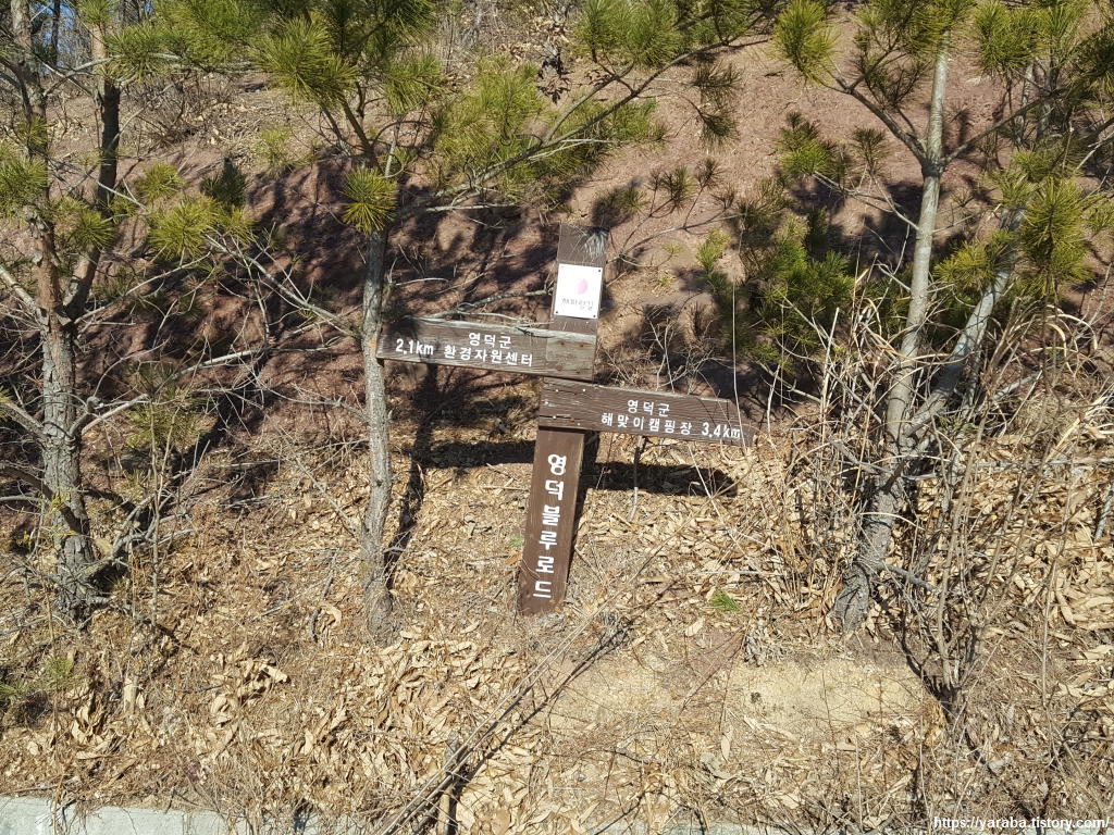 해맞이 공원 안내판을 따라 하저로 도로변을 걷다가 영덕군 환경 자원 관리 센터 표지판을 보면서 길을 건너 좌회전한다. 따로 횡단보도가 없고 도로가 내리막길인 데다가 반대편은 커브길이라 조심해서 길을 건너야 한다.
