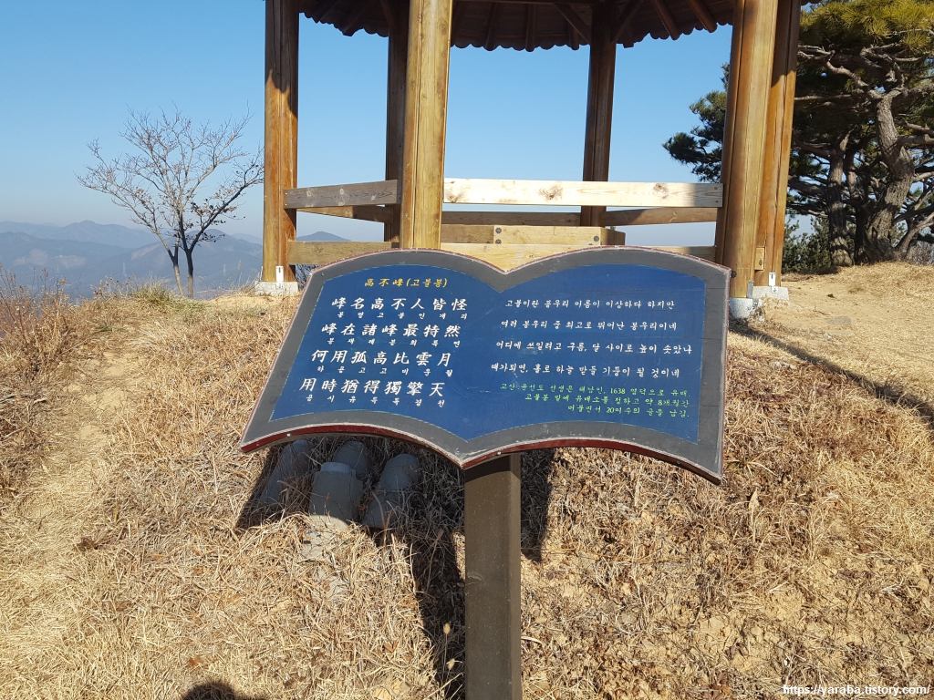 고불봉(高不峯, 235m)이라는 이름은 "높지 않은 봉우리" 의미이지만 주변의 고만고만한 봉우리 중에서는 으뜸이라 이곳에 보는 전망은 최고라고 할만하다. 1638년 유배를 온 고산 윤선도가 이곳의 경치에 반해서 고불봉 아래에 유배소를 정하고 "고불봉"이란 시를 남겼다.