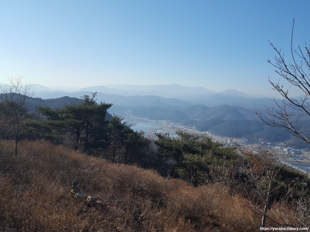 고불봉에서 바라본 강구면 방면의 모습이다. 구불구불한 오십천과 대비를 이루며 직선으로 대지를 가로지르는 동해선 철로가 눈에 들어온다.