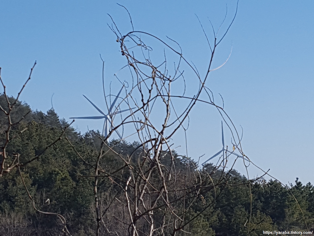 획일화된 숲이 아니라 자작나무를 비롯한 다양한 나무가 살아가고 있는 산길을 걷는 것은 정말 즐거운 일이다. 임도에서 드디어 풍력 발전기가 눈에 들어오기 시작한다.
