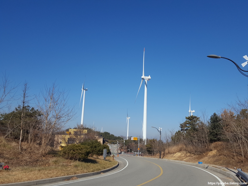 햇빛에 빛나는 풍력 발전기가 도는 모습을 보니 머리도 빙빙 돈다.