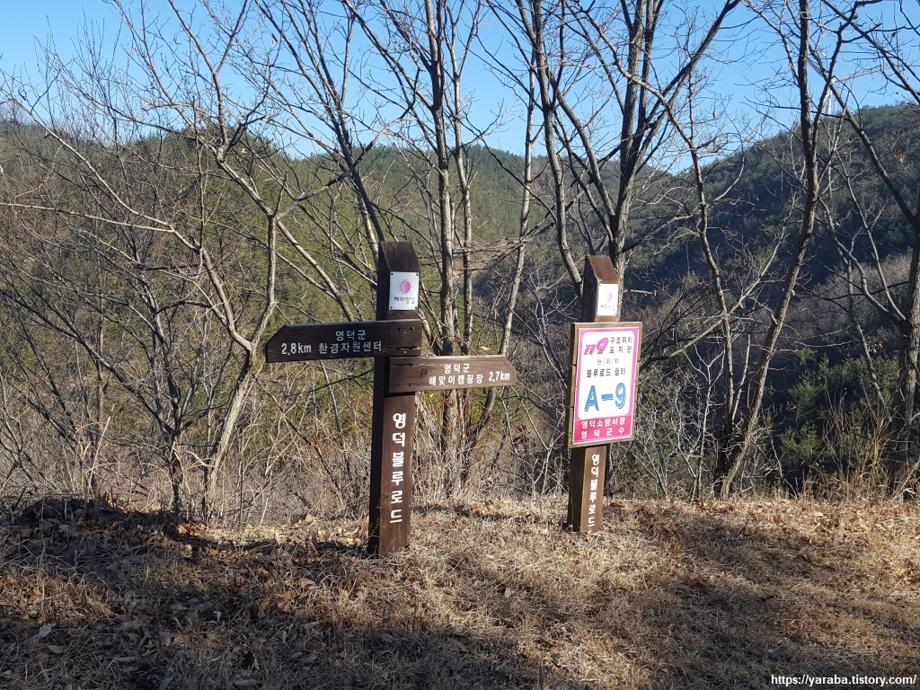 우리가 남은 도시락을 먹으면서 푹 쉬었던 정자가 위치한 곳은 산림 생태 공원 입구이다. 남은 거리는 5.1 Km 정도다. 시간 계산을 해보니 영덕 해맞이 공원에서 강구역으로 가는 버스를 타려면 14:40 또는 15:40 버스가 그 후보였다. 원래의 해파랑길이라면 헬기장에서 창포리로 돌아서 가야 하지만 도로를 따라서 직진하여 창포말 등대로 가기로 했다.