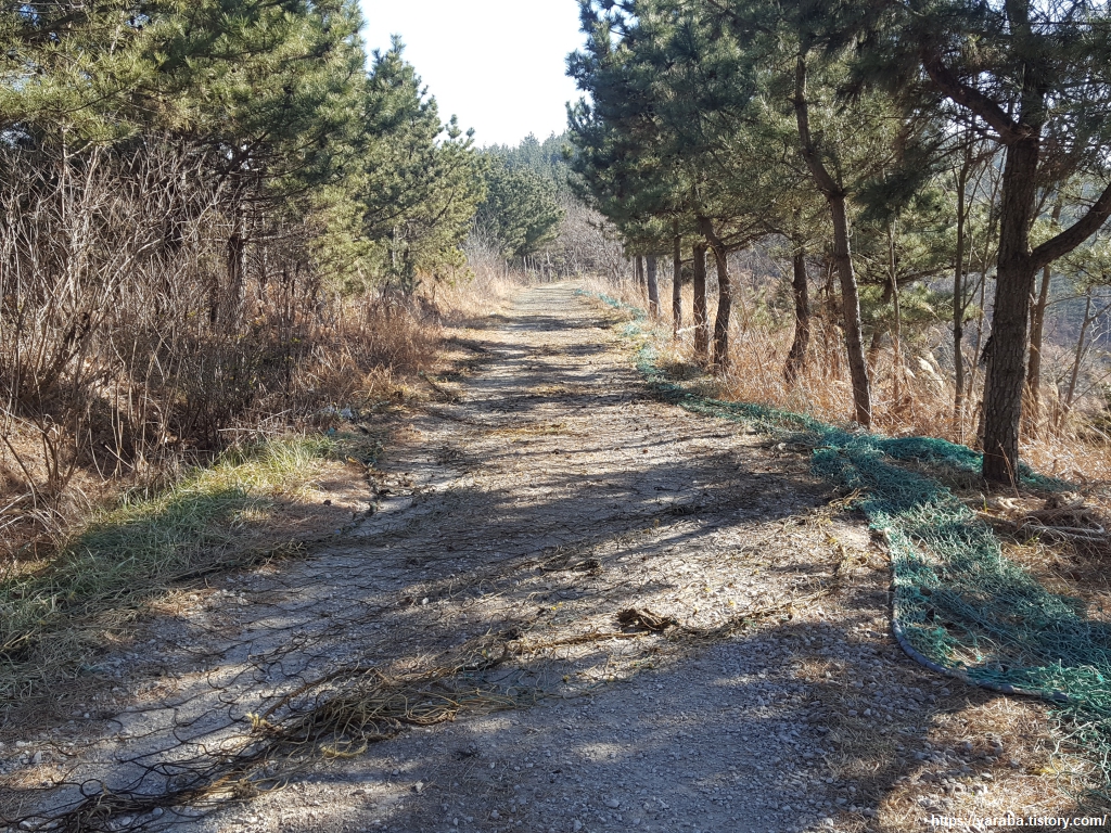 해변에 있어야 할 물고기 그물이 산중에 있다. 일정한 장소에 장기간 그물을 고정해 놓는 정치망 어업은 오랜 시간 어업을 진행하다 보면 각종 조류가 끼면서 주기적으로 바다에서 꺼내 말리고 터는 작업을 진행해야 하는데 이 좁은 땅 덩어리에서 그물을 넓게 펴서 말릴 공간도 부족하고 말리면서 나는 악취 때문에 민원이 빗발 한다고 한다. 결국 이렇게 인적이 드문 임도까지 그물 말리는 장소가 되었나 보다.