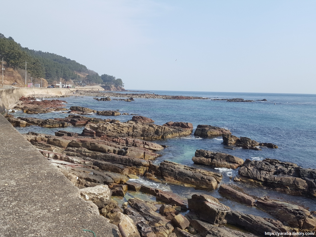 화려한 암석 지대가 펼쳐진 해안을 따라서 대게 원조 마을로 향한다.