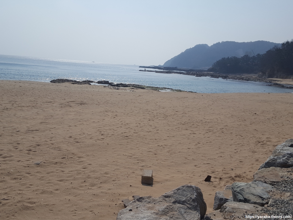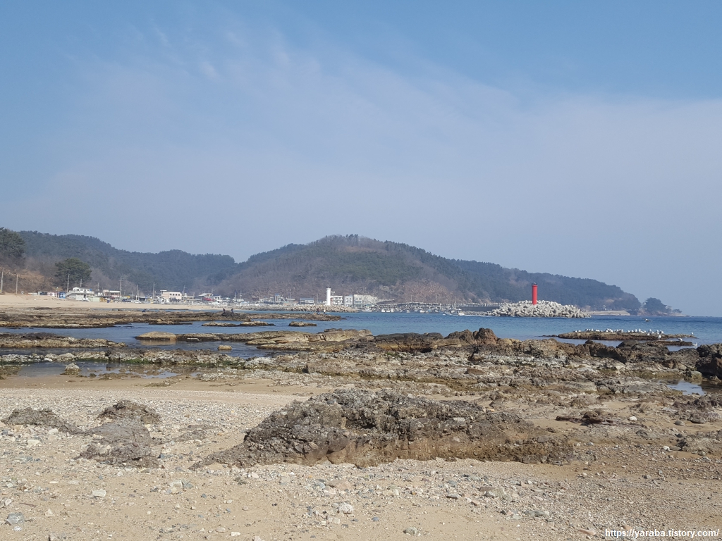 해안을 바위 지대를 돌아가는 우회로는 얕은 물의 넓은 암석지대로 푹푹 빠지는 모래도 아니고, 물이 첨벙거리는 것도 아니어서 걸어서 지나기에 무리는 없다. 멀리 경정항의 좌우 등대가 눈에 들어오기 시작한다.