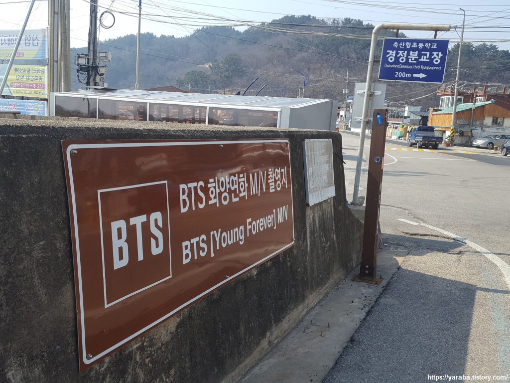 경정항을 지나면 해안을 따라 돌아가는 영덕 대게로 길을 따라 걷는다. 해안도로 방호벽에는 BTS 화양연화 앨범의 뮤직비디오 촬영지라는 안내판이 붙어있다. 지금이야 전 세계적으로 인정해주는 그룹이 되었지만 2015년 이 앨범을 통해서 팬덤이 확장되고 대중으로부터 인정받게 되었다고 한다. 화양연화라고 하면 양가위 감독의 영화도 있고 이승환의 노래도 있지만 인생에서 "가장 아름답고 행복한 순간"을 의미한다고 한다. BTS는 그 아름다운 청춘의 양면을 직접 노래했다고 하지만, 내 인생에서 내가 하고 싶은 것을 열정적으로 몰두하는 순간이 화양연화가 아닌가 싶다.