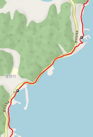 경정 3리 오매항을 지나서 언덕을 넘어가면 경정 해수욕장과 경정항, 경정 2리 방파제를 지나서 말미산 숲길로 들어간다.
