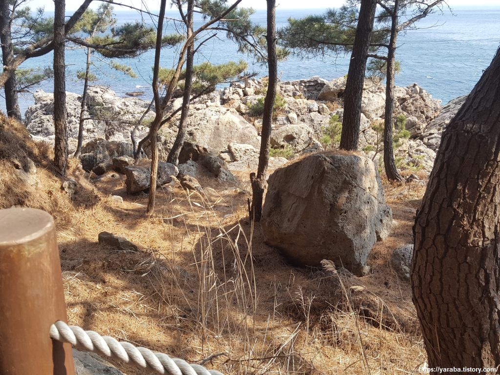 바위길을 걷다가 잠시 바위 절벽 아래 해변가 아주 작은 모래밭을 지날 때는 자연의 위압감과 생경스러운 풍경에 당황스러울 뿐이다.