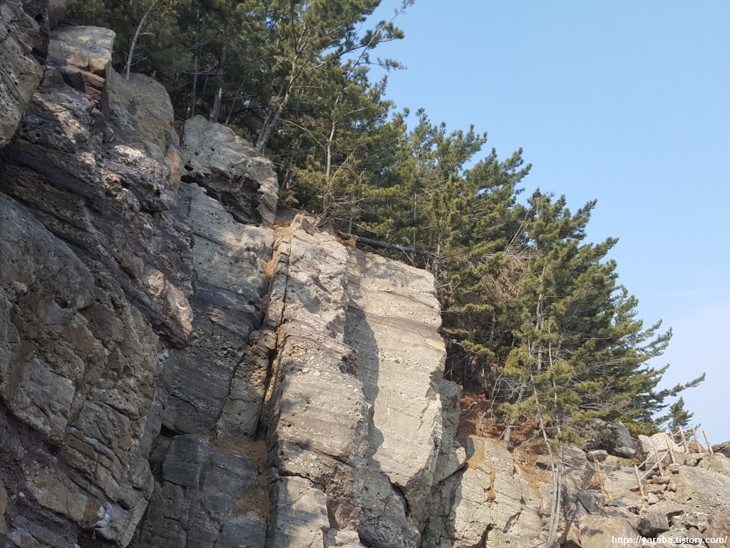 억겁의 세월을 새겨놓은 퇴적암 절벽 위에서는 어떻게 나무가 뿌리를 내렸을까 싶을 위치까지 소나무가 꿋꿋하게 자리를 차지하고 있다.