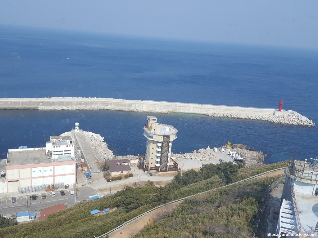 전망대에서 바라본 축산 방파제와 조금 있으면 만나게 될 깔끔한 축산항의 모습이다. 축산항 끝자락으로는 점심 식사 후에 올라갈 22코스의 와우산도 보인다.