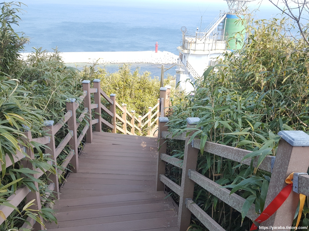 전망대를 올라온 반대 방향으로 내려간다. 전망대 휴게소가 있는 방향, 축산 방파제 방향으로 내려간다.