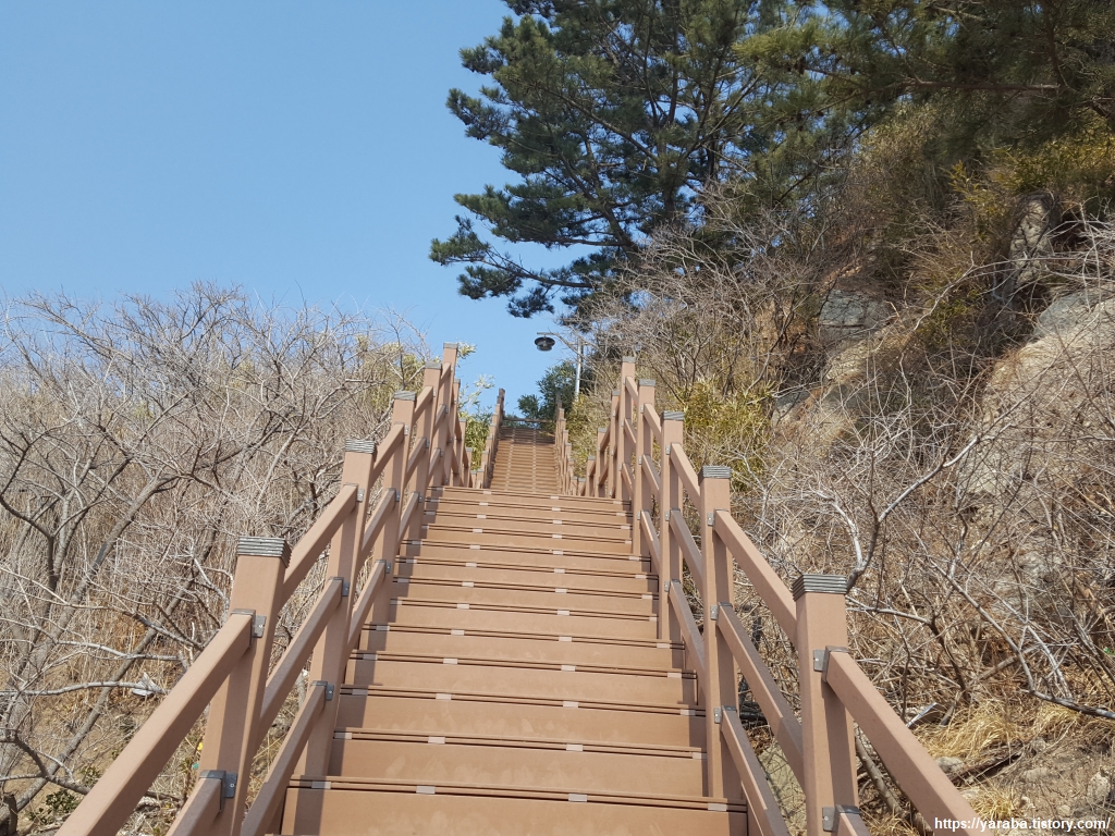 무거운 몸을 이끌고 다시 오르막을 오르자니 입에서는 뜨거운 입김이 훌훌 나오고 머리에서는 서늘한 날씨에도 땀이 흐르고 목에서는 남은 힘을 쥐어짜듯 하나, 둘 하는 구호가 절로 쏟아져 나온다. 전망대까지는 이런 데크 계단을 이어가야 한다.