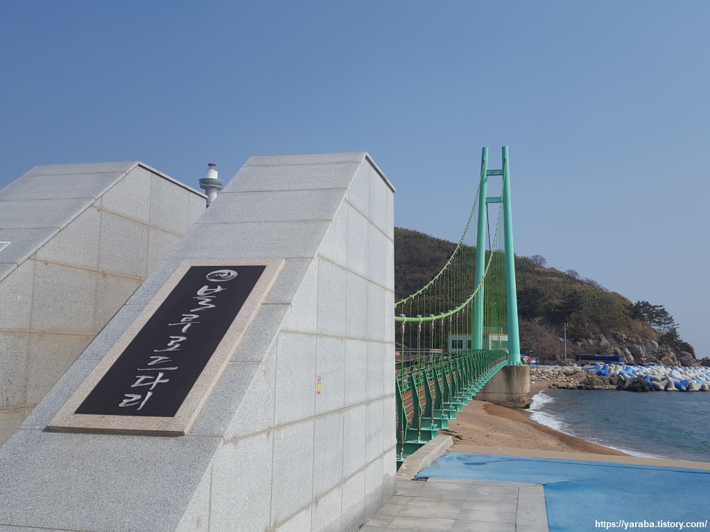 "블루로드 다리"라는 이름이 새겨진 죽도산 현수교. 사람만 지날 수 있는 인도교다. 해파랑길에는 걷기를 돕는 이런 다리들이 곳곳에 만들어지고 있다.