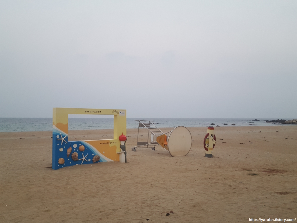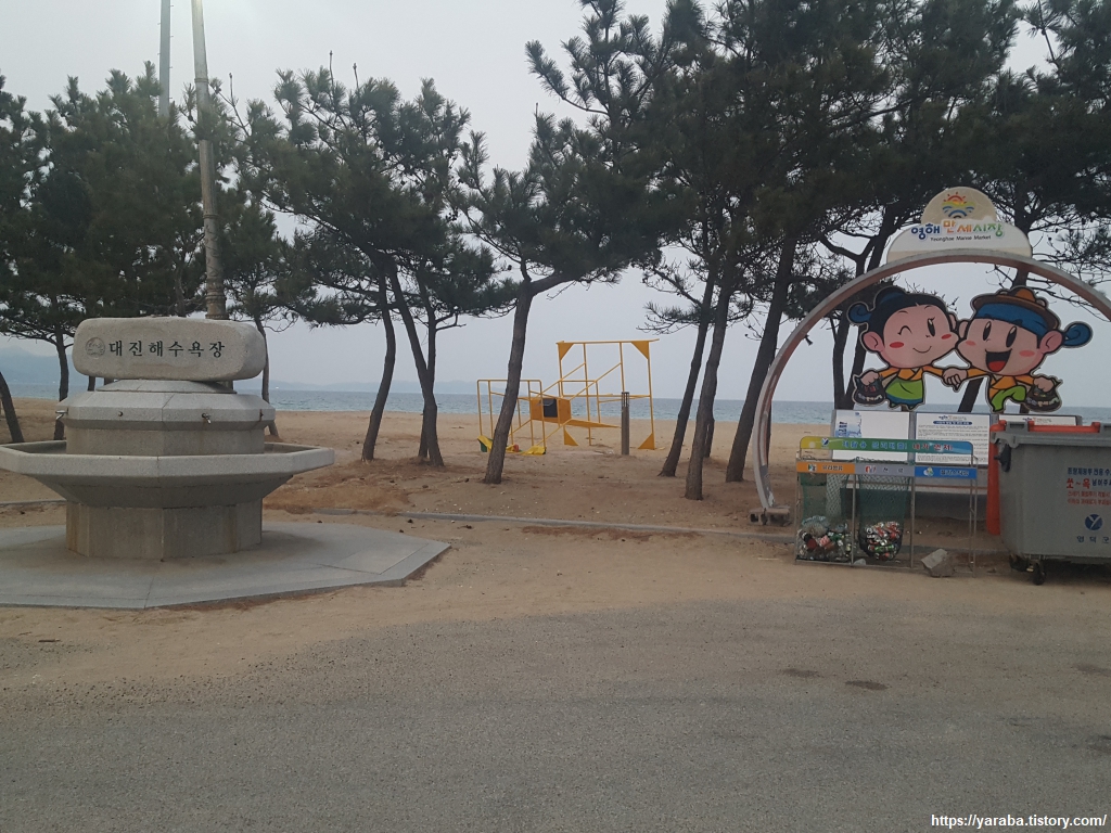 대진 해수욕장에 도착했다. 바다도 깊지 않고 굵은 모래로 몸에 잘 붙지 않으니 여름 해수욕으로는 최고인 곳이다. 영해 읍내에 있는 영해 만세 시장에 대한 안내판도 붙어 있다. 영해면 전체를 휘감아 내려온 송천이 이곳에서 바다와 만난다. 해수욕과 민물 수영을 동시에 즐길 수 있는 곳이다.