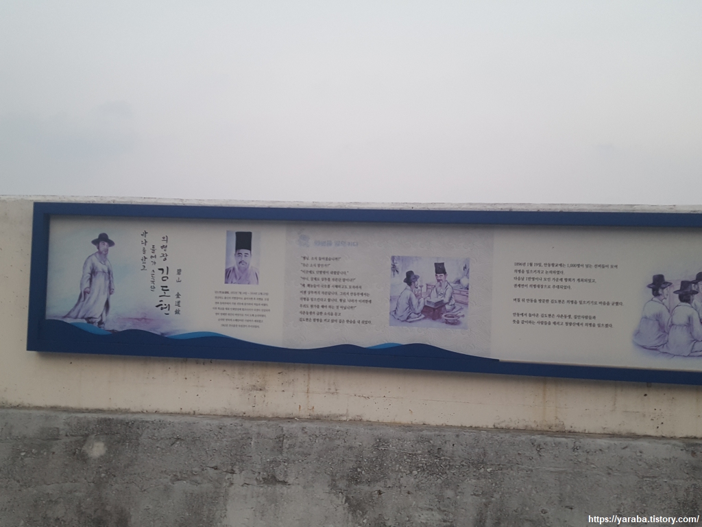 도해단이라는 곳이다. 구한말 의병장이었던 김도현 선생이 비각 앞의 비석에 새겨진 유시(절명시)를 남기고 바다로 걸어 들어가 순국했다는 장소다. 한일 합방으로 어떤 분들은 폭탄 투척으로 어떤 분들은 스스로 생을 마감한 분들도 계셨는데 이분은 바다로 걸어 들어가는 방법으로 순국하셨다고 한다.