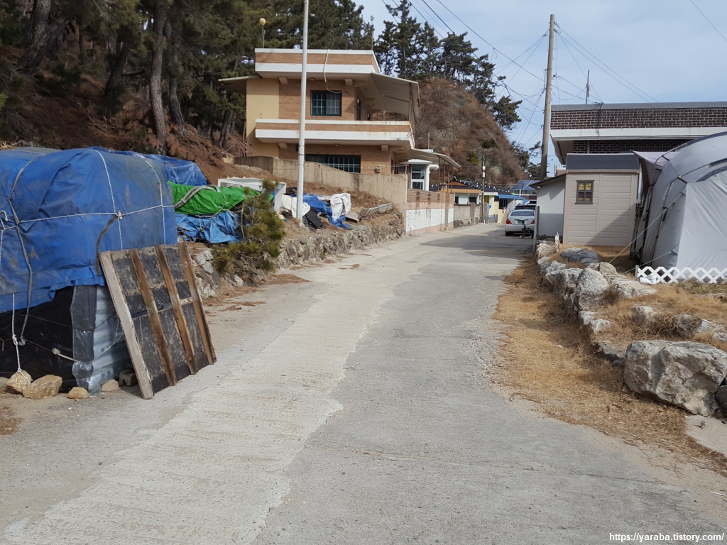 해파랑길은 잠시 마을길 안으로 들어가지만 이내 해변길로 나온다. 마을 전체가 미역발을 꺼내 놓고 미역 말리기를 준비하고 있다. 이곳 사람들에게 돌미역은 돈을 만들어 주는 생명줄과 같은 존재였다고 한다. 마을 또는 어촌계별로 미역짬을 나누거나 수확량을 나누는 방식으로 공동 작업하는 모양이었다.