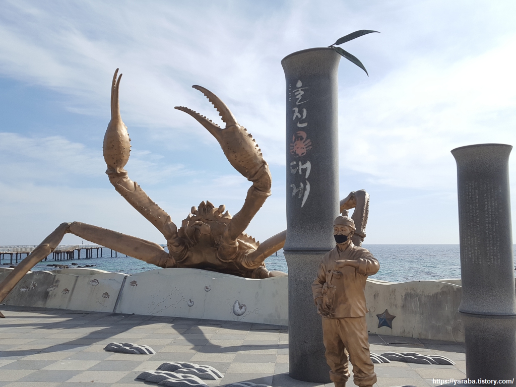 원산지 마을답게 울진 대게 조형물을 세워 놓았다. 황금 대게 평해 공원이다. 대게는 큰 게라는 의미가 아니라 다리가 대나무 비슷해서 붙은 이름이란 것을 조형물로 잘 표현하고 있다. 고려 때부터 대게로 유명했다니..... 상당히 깊은 곳에 서식하는 대게를 그 당시에는 어떻게 잡았을까? 하는 호기심도 생긴다.