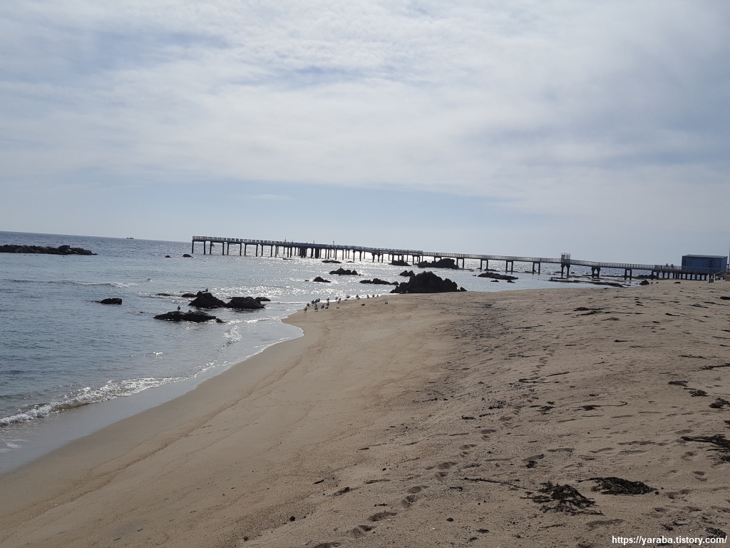 해변길 바위 위에 아담하게 만들어 놓은 쉼터에서 목을 축이며 잠시 쉬어간다. 쉼터에서 바라본 해상 낚시 공원의 전경이다.