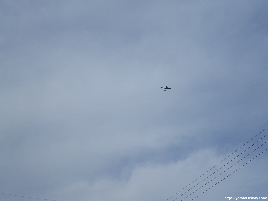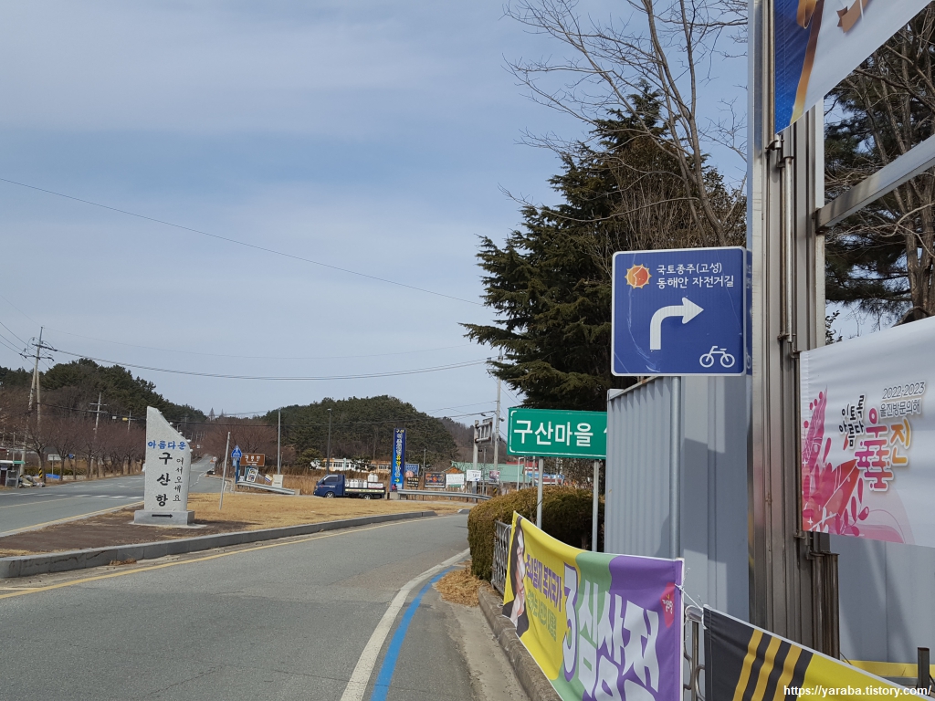 울진 해파랑길은 중간중간 해파랑길 표지판과 비슷한 안내판을 만나는데 자전거 도로 안내판이다. 가는 길은 비슷하고 거리가 비슷해도 속도는 차이가 크다. 걷기와 자전거는 통상 4배의 속도차가 난다고 한다. 구산리 쉼터에서 쉬어 가는데 머리 위로 경비행기 한대가 웅 소리를 내며 지나간다. 구산항은 인근에 울진 비행 훈련원이 있어서 어느 정도의 간격으로 비행기 이륙을 목격할 수 있는 장소이다.