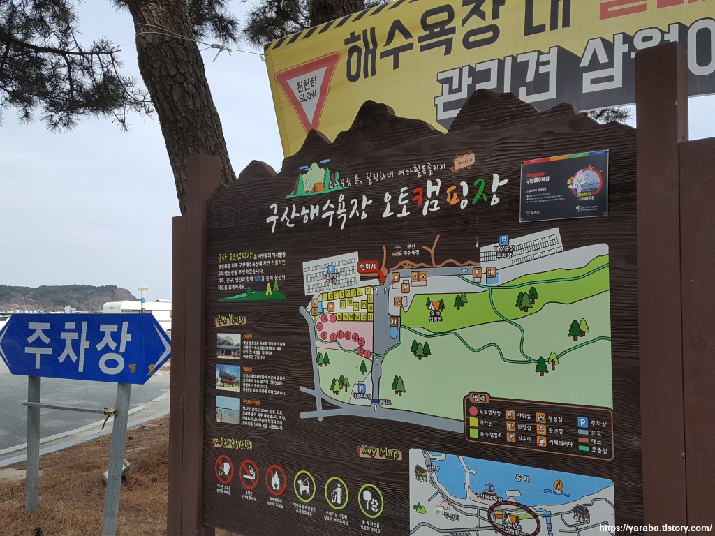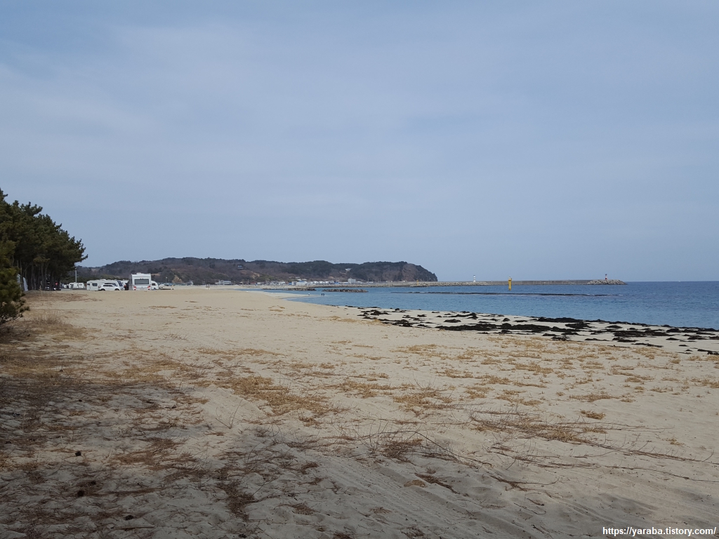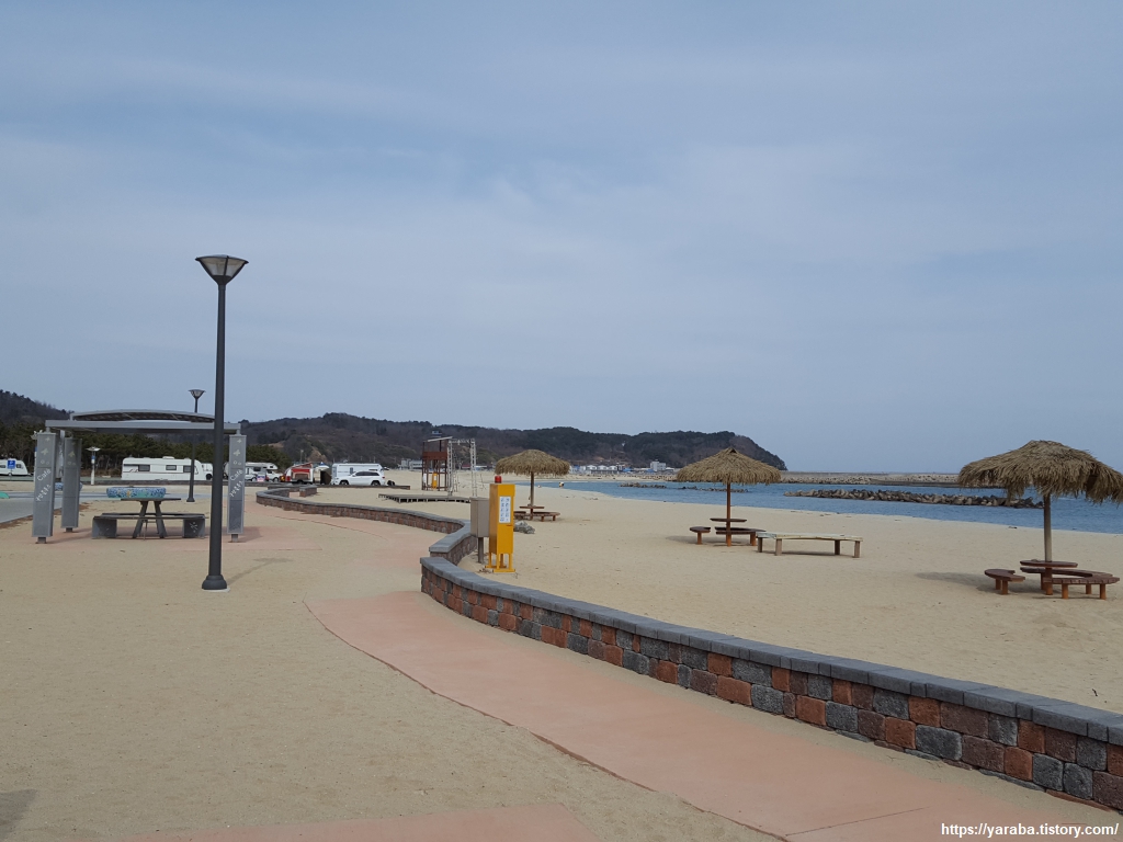 구산 해수욕장 좌측으로는 오토캠핑장과 카라반이 자리하고 있어서 해파랑길은 해수욕장 정문으로 나가서 구산리 마을길로 돌아가야 한다.
